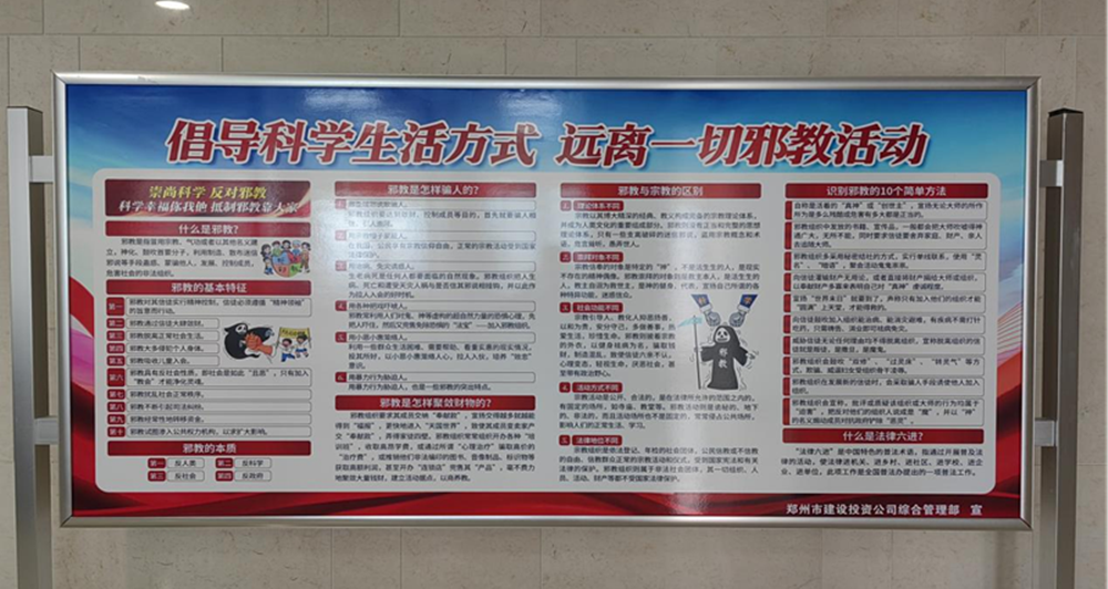 為了進(jìn)一步提高國企員工反邪教意識(shí),認(rèn)識(shí)邪教的危害,切實(shí)增強(qiáng)自覺抵御邪教侵蝕的能力,營造積極向上、健康和諧的工作氛圍。4月25日下午,鄭州市建設(shè)投資集團(tuán)有限公司組織全體干部員工開展反對邪教宣傳活動(dòng)。利用PPT宣講、宣傳展板、網(wǎng)站、懸掛橫幅等方式,向員工宣傳邪教的種類、危害和邪教組織的種類等,引導(dǎo)國企干部職工認(rèn)清邪教本質(zhì),提高識(shí)邪、防邪、拒邪能力,筑牢反邪教思想防線,做到對邪教歪理邪說不聽、不看、不信、不傳。